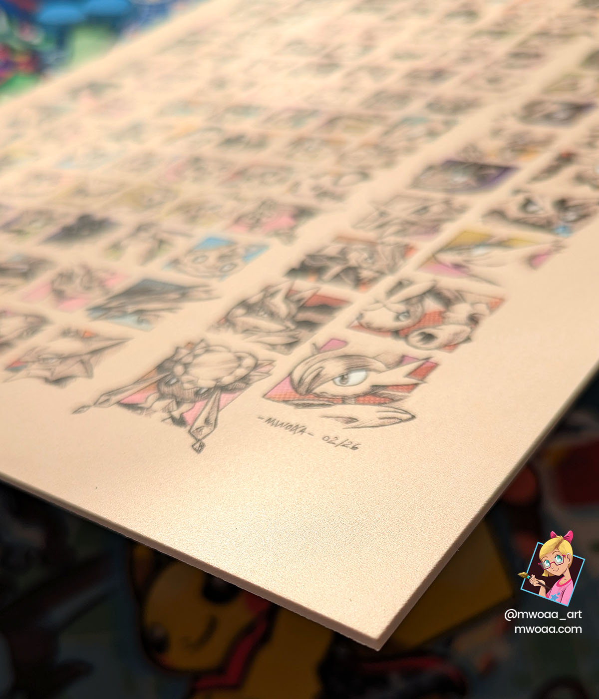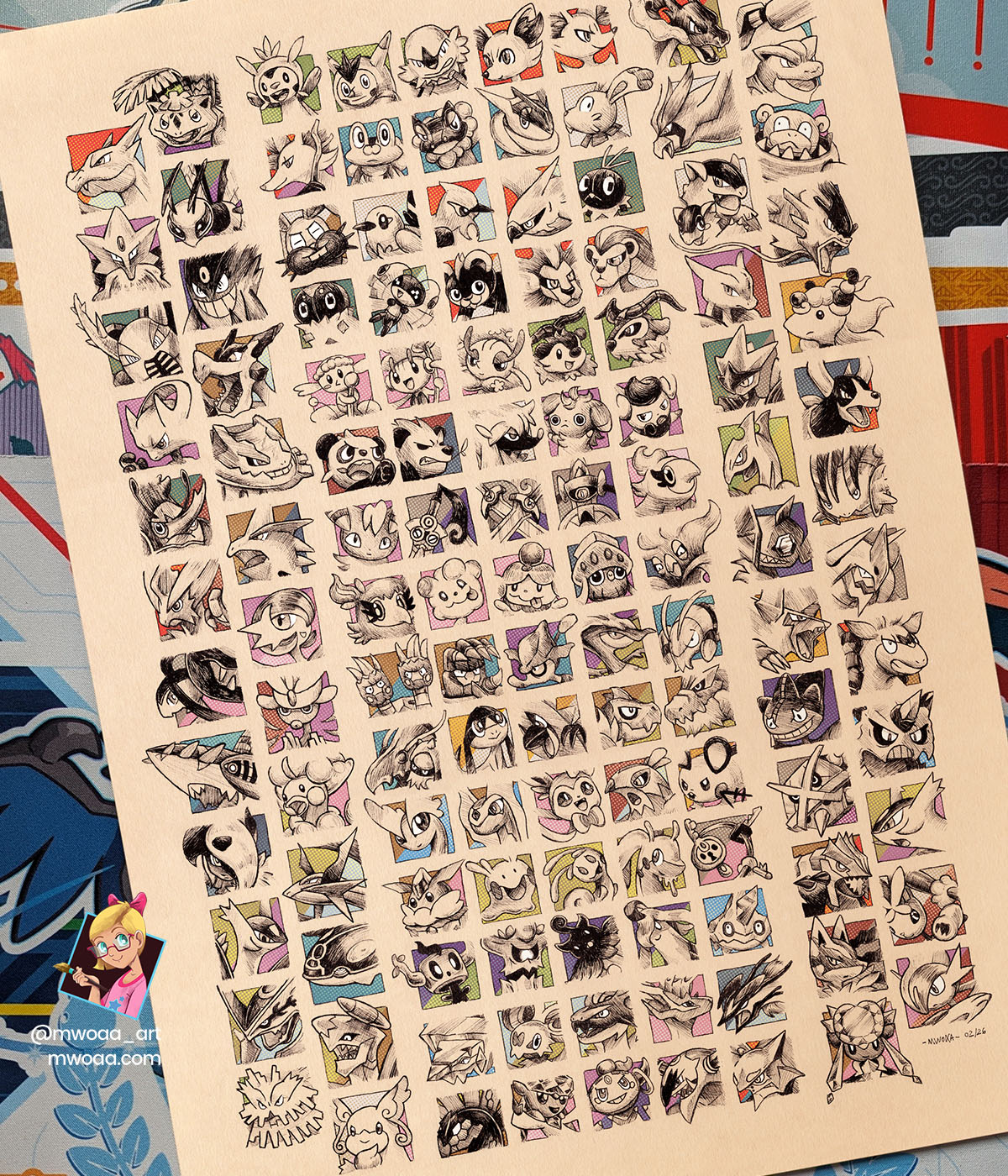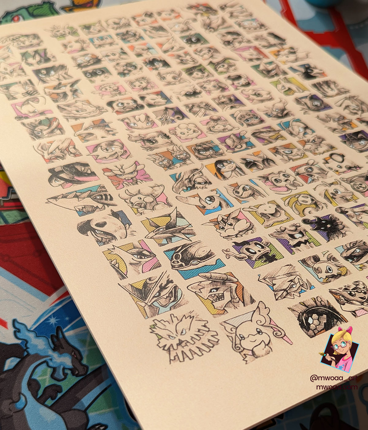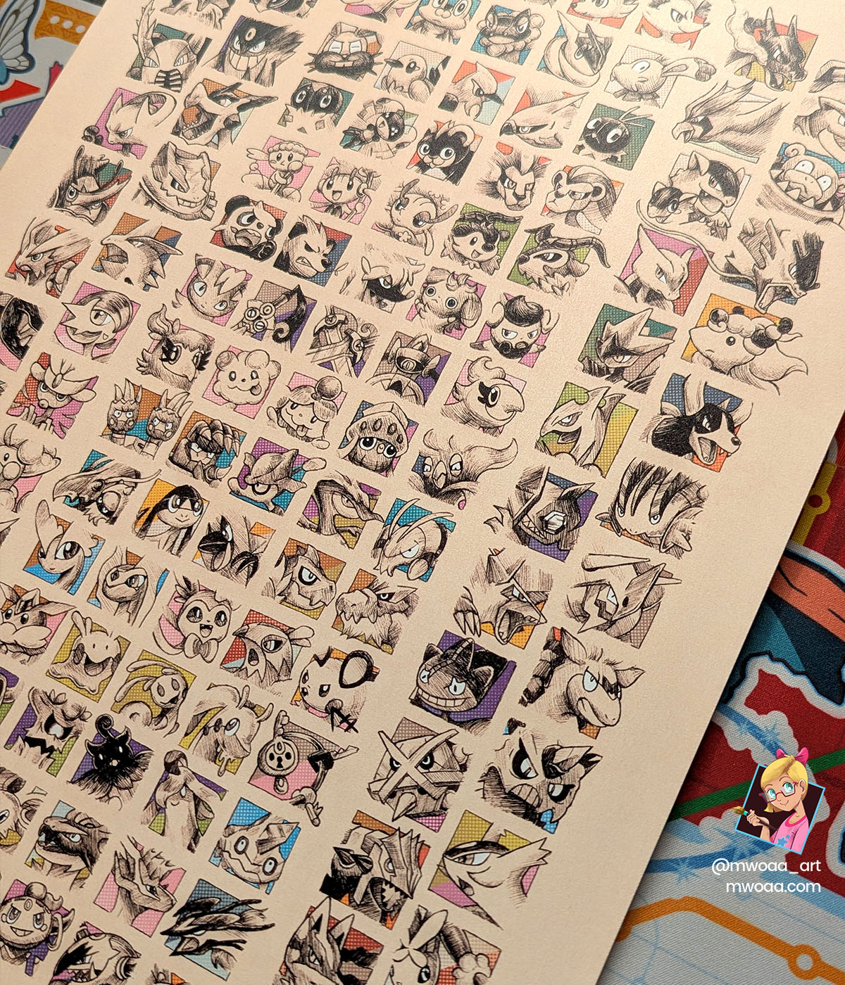 I chose to illustrate all the Pokémon from the 6th generation on one sheet. Each Pokémon have been drawn in a small 2x2 cm square (0.78x0.78 in) on a kraft-colored paper with black pens, then digitally colored then printed on FOREX. I spent over 50h to finalize this illustration the way you can see it now.